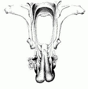 Once the fingers have reached the base of the uterine horn, the bifurcation of the horns can be appreciated. At this time, the two intercornual ligaments can be palpated: The dorsal intercornual ligament which is the smaller and thinner of the two, and the ventral intercornual ligament which is larger and thicker. The ventral intercornual ligament will be used for retraction of the uterus, the dorsal one being too fragile for the task (3, 10). |