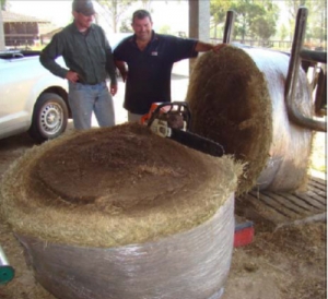 Two batches of hay with high moisture content (approx. 30 per cent) were made into 1.2 m diameter round bales and their weight, temperature and feed quality were monitored over time.