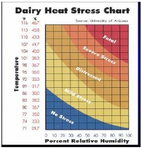 Usually, the combined temperature and humidity that result in a temperature/humidity index of greater than 90 will result in severe signs of heat stress in the high-producing cow and moderate signs in lower-producing cows. In severe cases, cows may die from extreme heat, especially when complicated with other stresses such as illness or calving.