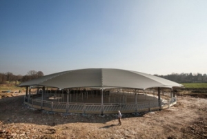 The new Roundhouse 45 (RH45) has a diameter of 45 meters, a circumference of 144 meters, and an internal area of over 1500 sq meters. Consequently it can hold just over 300 beef animals at 500 kgs, and 180 dairy cows. Although the Rh30 is already used on dairy farms it is primarily used for calves, heifers and dry cows. The Rh45 makes the round building concept applicable for milking cows for the first time, and one has already been erected for that purpose in Nottinghamshire. This building (which currently has no internal fittings) will have three robots adjacent.