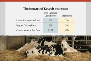 Wisconsin DHI data reflect the potential costs and risks with ketosis. In a field study, 3,400 herds and 215,000 cows over three years were evaluated using milk ketone analysis from day five to day 21 after calving. First lactation cows that had ketosis had a 22% chance for ketosis in the next lactation. Older cows had a 45% chance of developing ketosis in the next lactation if they had ketosis in the current lactation. Milk ketone tests are available in U.S. and Canadian DHI labs.