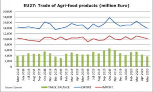 However, between January and May 2020, the total value of EU27 agri-food exports rose by 2 percent compared to the same period in 2019, reaching €75.8 billion, while the value of imports increased to €52.7 billion (a rise of nearly 1 percent).