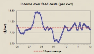 The corn price increased 4¢/bushel to $5.90 and soybeans increased 20¢/bushel to $11.70, but alfalfa hay dropped $7/ton to $192.00. Feed costs compute out to $10.85 per hundred pounds of milk, leaving “Income over feed costs” of $8.35/cwt., down from $8.86/cwt. in December. This is below the 10-year average IOFC of $8.98/cwt. (see chart).
