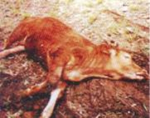 Mổ khám sau khi thú chết phát hiện nhiều vùng phổi ở phía bụng và phía trước phổi bị cứng lại và đối xứng 2 bên. Các sợi fibrin tích lại trong xoang ngực phổi xuất huyết rõ, có nhiều bọc mủ (abcess) nhỏ màu trắng. Mổ khám não thì màng não mờ đục xuất huyết lấm tấm, tiểu não xuất huyết và gây tổn thương não.