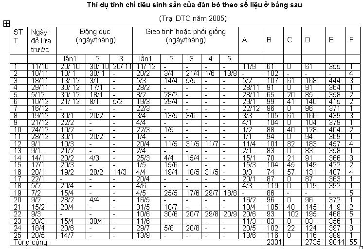 Thí dụ: Một đàn có 100 bò cái sinh sản, số liệu phối giống được ghi nhận như sau: