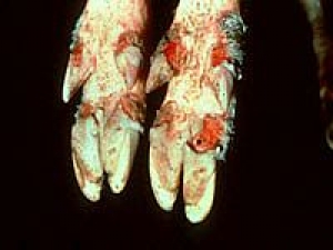 Giã nhỏ phèn xanh, nghệ hòa với nước lá ổi bôi vào vết loét. Sau đó rắc bột sunphamit vào đó.