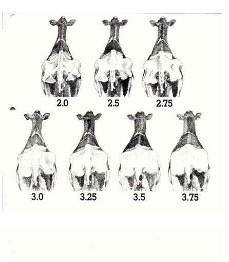 - Đánh giá bằng thị giác: nhìn vào các phần lõm (gốc đuôi, lõmhông, khe sống lưng) và các phần của các đầu nhô của xương ngồi, xương chậu, xương sườn.