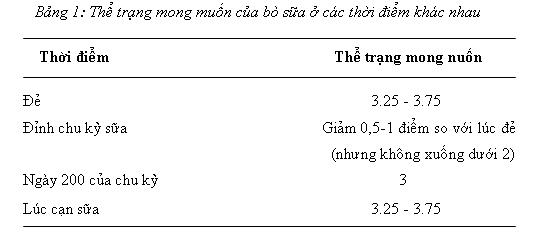 Việc nuôi dưỡng bò sữa phải được điều chỉnh hợp lý và kịp thời sao cho sự thay đổi thể trạng diễn ra đúng như trong bảng 1 hay đồ thị 2. Lúc bò đẻ điểm thể trạng lý tưởng nhất là 3,5. Sau đó điểm thể trạng vào đỉnh của chu kỳ sữa có thể giảm 0,5-1 so với lúc đẻ, nhưng không được để bò tụt điểm thể trạng xuống dưới 2. Qua điểm cực tiểu này thể trạng của bò phải được tăng lên và đạt khoảng 3 vào ngày thứ 200 của chu kỳ và đạt 3,5 vào lúc cạn sữa. Mức thể trạng này phải được duy trì cho đến khi bò đẻ.