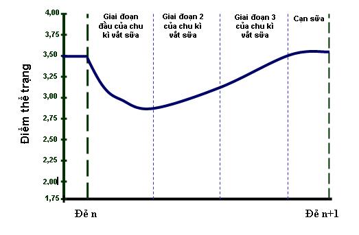 Người chăn nuôi cần nắm được quy luật thay đổi thể trạng của bò qua các giai đoạn của chu kỳ vắt sữa/sinh sản (đồ thị 1) để quản lýviệc nuôi dưỡng cho hợp lý nhằm có được sự thay đổi thể trạng thực tế ở bò theo ý muốn.