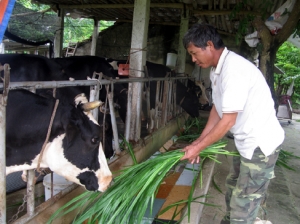 Tìm hiểu mô hình nuôi bò sữa nơi đây chúng tôi đến gia đình ông Chu Văn Bằng, một trong những hộ đầu tiên nuôi bò sữa tại thôn Cầu Chang, xã Bồ Lý. Ông Bằng cho biết: sau nhiều năm gắn bó với chăn nuôi lợn, gà nhưng do hay bị dịch bệnh, giá cả thì bấp bênh, lợi nhuận thấp và không ổn định, năm 2011 gia đình đã chuyển đổi sang chăn nuôi bò sữa, ban đầu mua 2 con. Để có kinh nghiệm chăn nuôi bò sữa, ông thường xuyên đi học hỏi kinh nghiệm từ những người chăn nuôi ở các nơi như Vĩnh Thịnh (Vĩnh Tường), Thái Hòa (Lập Thạch)… tìm hiểu qua sách, báo. Nhờ chịu khó học hỏi kinh nghiệm, đàn bò của gia đình phát triển tốt và đem lại thu nhập cao. Theo ông Bằng, nuôi bò sữa không khó bởi bò sữa ít bị bệnh dịch, nhưng người nuôi bò sữa phải chịu khó, tuân thủ chế độ nuôi dưỡng và thời gian cho ăn hàng ngày. Nhằm đảm bảo chi phí đầu vào và chất lượng sữa, ngoài nguồn cỏ tươi, ông cho bò ăn thêm thức ăn chăn nuôi tổng hợp. Trung bình mỗi ngày, một con bò ăn hết khoảng 10kg thức ăn tổng hợp và 20 kg cỏ tươi. Ngoài 6 sào ruộng, tất cả đất vườn quanh nhà được gia đình ông tận dụng trồng cỏ voi, đảm bảo đủ thức ăn cho bò quanh năm.