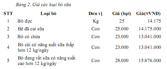 Giá thu mua sữa nguyên liệu (sữa tươi) tại cổng trang trại là khoảng 15,6 bạt/kg (≈ 8.986 VNĐ/kg), giá thu mua tại các hợp tác xã chăn nuôi bò sữa là 16,5-