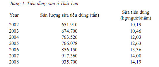 Kinh tế và thu nhập tăng nên người dân Thái tiêu dùng ngày càng nhiều sữa và các sản phẩm sữa. Xem chi tiết ở Bảng 3 về sản lượng sữa tiêu dùng và lượng sữa tiêu dùng/đầu người/năm. Số liệu từ bảng này cho thấy, tổng sản lượng sữa tiêu dùng và lượng sữa tiêu dùng/người/năm tăng tương ứng là 6,2% và 5,7%. Sữa tiêu dùng ở đây bao gồm sữa thanh trùng, sữa tiệt trùng, sữa chua và yogurt.