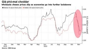 Giá phô-mai và các sản phẩm sữa khác trên thị trường thế giới đang giảm mạnh vì làn sóng Covid-19 mới giữ chân các thực khách ở nhà thay vì đến nhà hàng.