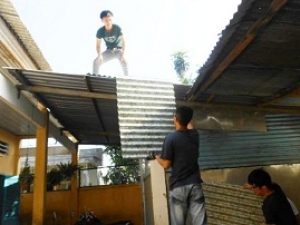 Các tình nguyện viên lớp mái trường bằng tấm lợp sinh thái làm từ 1,5 triệu vỏ hộp sữa