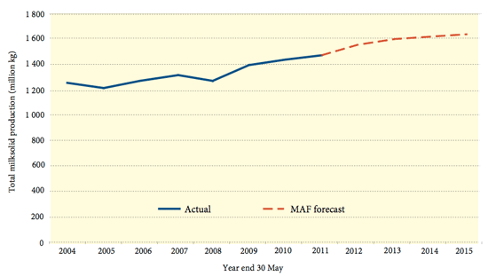 MAF dự kiến rằng việc sản lượng sữa khô sẽ tăng lên 2,4% trong năm kết thúc vào ngày 30/5/2011, 5,7% trong mùa sữa năm 2011/12 và 2,9% và 1,2% trong những năm tiếp theo.