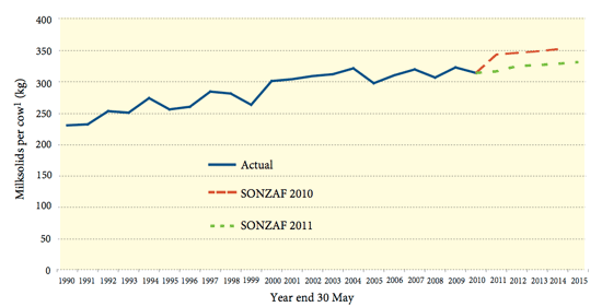 Trong báo cáo năm vừa rồi, MAF dự báo sản lượng sữa sẽ tăng lên 14% trong mùa sữa năm 2010/11. Sản lượng sữa tăng thêm 2,9% và 2,1% đã được dự báo cho các mùa sữa năm 2011/12 và 2012/13 tương ứng. Các dự báo này được dựa trên cơ sở ba giả định chính: sự gia tăng về số lượng bò cái và bê cái lấy sữa; sự gia tăng sản lượng sữa khô/con bò cái sản xuất ra; và các điều kiện thời tiết để trở lại mức trung bình 30 năm. Tuy nhiên, khi điều này đã thay đổi hoàn toàn, số lượng bò cái thực tế đã tăng ít hơn so với dự kiến và thời tiết khô hanh trong mùa xuân và mùa hè đến sớm hơn so với thường lệ làm cho lượng sữa khô của mỗi con bò cái tăng lên ít hơn. Sự thay đổi thực tế liên quan tới các giả định dự báo có nghĩa là dự báo về sự gia tăng sản lượng sữa khô đã không thành hiện thực.