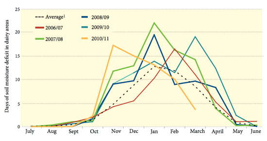 Thời tiết đóng một vai trò quan trọng khác trong các dự báo. Tổng lượng sữa khô sản xuất ra trong một vụ là rất nhạy cảm với sự thay đổi của thời tiết vì hệ thống sản xuất sữa của New Zealand phụ thuộc vào cỏ mọc trong cả vụ sản xuất, không giống như ở Mỹ và ở Châu Âu, là những nơi hầu hết đều sử dụng các hệ thống cung cấp thức ăn dạng hạt ngũ cốc. Qua một vài vụ sữa trước, thời tiết ở New Zealand đã thay đổi cơ bản từ mức trung bình của 30 năm, do vậy dẫn đến sự gia tăng thay đổi giữa dự báo và sản xuất thực tế. Hình 15.3 cho thấy số ngày thiếu độ ẩm đất ở các vùng sản xuất sữa trong 5 vụ sữa vừa qua so với mức trung bình của 30 năm.