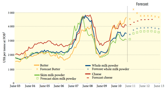 Giá sữa của vụ sữa năm 2010/11 được dự kiến là 7,50 USD/kg sữa bột, thấp hơn 9 xen so với mức giá cao lịch sử của ba vụ trước đó. Giá bán sữa quốc tế đã tăng lên khi vụ sữa được tiến hành, nâng gá bán sữa bột lên. MAF dự đoán giá sữa của năm kết thúc vào ngày 31/5/2012 sẽ là 6,78 USD/kg sữa bột. Giá bán này phản ánh giả định giá bán sữa quốc tế giảm đi khi nguồn cung trên thế giới bắt đầu đáp ứng được nhu cầu ngày càng tăng trên thế giới. Sau năm 2012, giả định về việc đồng đô-la ở New Zealand mất giá làm cho giá bán sữa gần như tăng lên, mà được dự đoán sẽ là 8,64 USD/kg sữa bột của năm kết thúc vào ngày 31/5/2015.