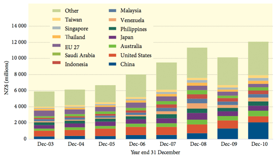 New Zealand là nước xuất khẩu sữa bột nguyên chất lớn nhất trên thế giới, và trong năm 2010 Trung Quốc đã vượt qua Algeria và Venezuela trở thành nước nhập khẩu lớn nhất. Trong khi nhu cầu đối với các sản phẩm sữa ở Trung Quốc đã tăng lên từ tất cả các nguồn, bao gồm cả các sản phẩm được sản xuất trong nước, hầu hết sữa bột nguyên chất nhập khẩu của Trung Quốc đều có nguồn gốc từ New Zealand, và 31% trong tổng lượng sữa bột nguyên chất của New Zealand xuất khẩu sang Trung Quốc. Có nhiều yếu tố làm tăng lượng sữa xuất khẩu sang Trung Quốc, bao gồm, ví dụ, sự tăng trưởng mạnh mẽ của nền kinh tế Trung Quốc, quy mô lớn của thị trường sữa Trung Quốc và sự phát triển nhanh chóng của nó, các ảnh hưởng của nguy cơ nhiễm melamine trong năm 2008 tới sự tin tưởng của người tiêu dùng đối với các sản phẩm sữa sản xuất trong nước, và Hiệp định Mậu dịch Tự do Trung Quốc – New Zealand, mà đã có hiệu lực trong tháng 10/2008. Xu hướng này làm tăng lượng sữa xuất khẩu vào Trung Quốc được dự kiến sẽ tiếp tục trong thời gian tới khi nhu cầu trong nước vẫn tiếp tục gia tăng.