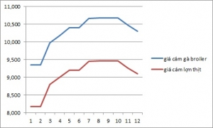 Trong tháng 12, giá ngô tăng 33% so với cùng kỳ năm ngoái là 7.611 đồng/kg. Giá cám gạo là 6.910 đồng/kg, tăng 29.5%. Giá sắn lát tăng 26.7%, lên 6.170 đồng/kg. Giá bột cá lên 21.222 đồng/kg, tăng 4%. Giá lyzin tăng 36% lên 55.139 đồng/kg. Giá Methionin ở mức 113.798 đồng/kg, tăng 12,2%. Giá khô dầu đầu tương cũng lên mức 10.212 đồng/kg, tăng 9%.