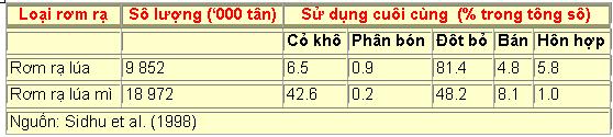 Một nghiên cứu về việc sử dụng cuối cùng rơm rạ lúa và rơm rạ lúa mì ở bang Punjab cho thấy dưới 10% rơm rạ lúa và 40% rơm rạ lúa mì được sản xuất ra hàng năm được sử dụng làm thức ăn cho vật nuôi. Các chủ trại ở các bang Haryana, Punjab và Tây Uttar Pradesh đã thay thế rất nhiều rơm rạ lúa và rơm rạ lúa mì từ các bữa ăn của động vật lấy sữa bằng các vụ cỏ cho sản lượng và chất lượng cao. Chỉ riêng bang Punjab có gần 8 triệu tấn rơm rạ lúa và khoảng 9 triệu tấn rơm rạ lúa mì được đốt bỏ tại chỗ hàng năm như là một giải pháp thải bỏ (Bảng 2).