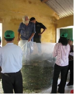 - Phải bảo đảm thức ăn truớc khi chất vào hố ủ có độ ẩm khoảng 65-70%. Nếu độ ẩm trên mức này cần phơi qua cho rút bớt nuớc. Nếu thức ăn khô, già quá thì vẩy thêm nuớc (hoặc tuới rỉ mật đuờng pha loãng) cho đủ độ ẩm nêu trên.